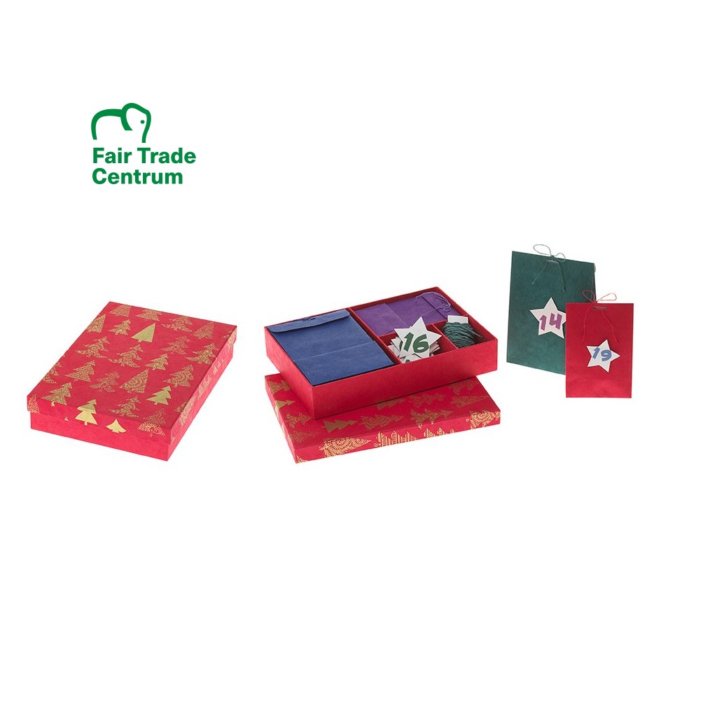 Všechen papír je vyrobený a zdobený přírodními barvami v Nepálu dle pravidel fair trade. Co dětem připravíte do jeho kapsiček už je na vás, posíláme prázdný. Používejte opakovaně a každý rok můžete kalendář naplnit něčím jiným.