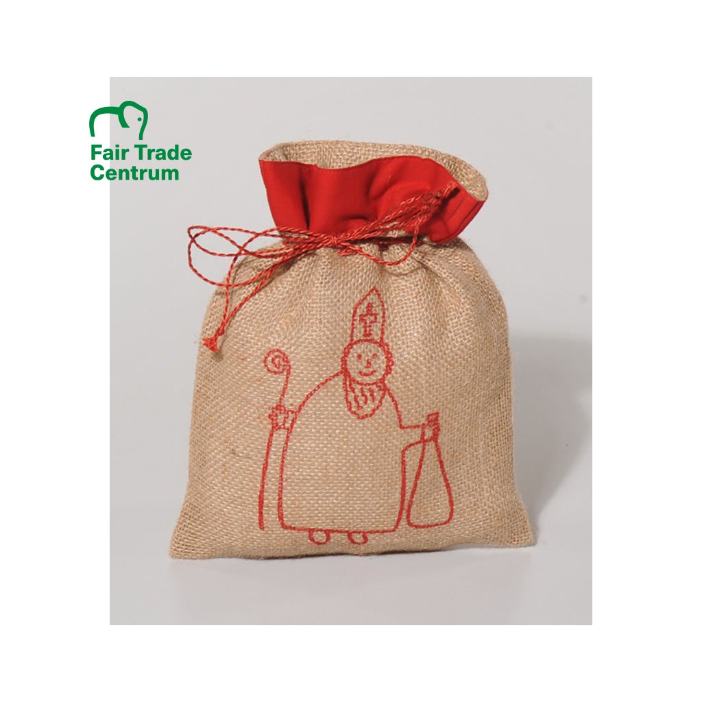Pěkný jutový sáček s ještě hezčí červenou kresbou svatého Mikuláše, který právě dětem nese v pytli dárky. Na spodním okraji červeného lemu je zabudované stahování sáčku, aby snad dárky nevypadly a vybalování bylo napínavější.