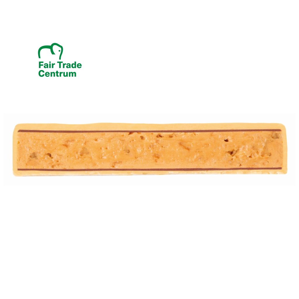 Krásně sladká a křupavá vánoční čokoláda ručně plněná karamelově mandlovým nugátem (60 %), který mistři čokolády sami vyrobili z karamelizovaných mandlí. Náplň doplňuje bílá čokoláda a jako překvapení spousta křupavých kousků vaflí jemně potažených mléčnou čokoládou. Celou náplň ukrývá sladká karamelová poleva a obal září výrazným zlatým efektem.