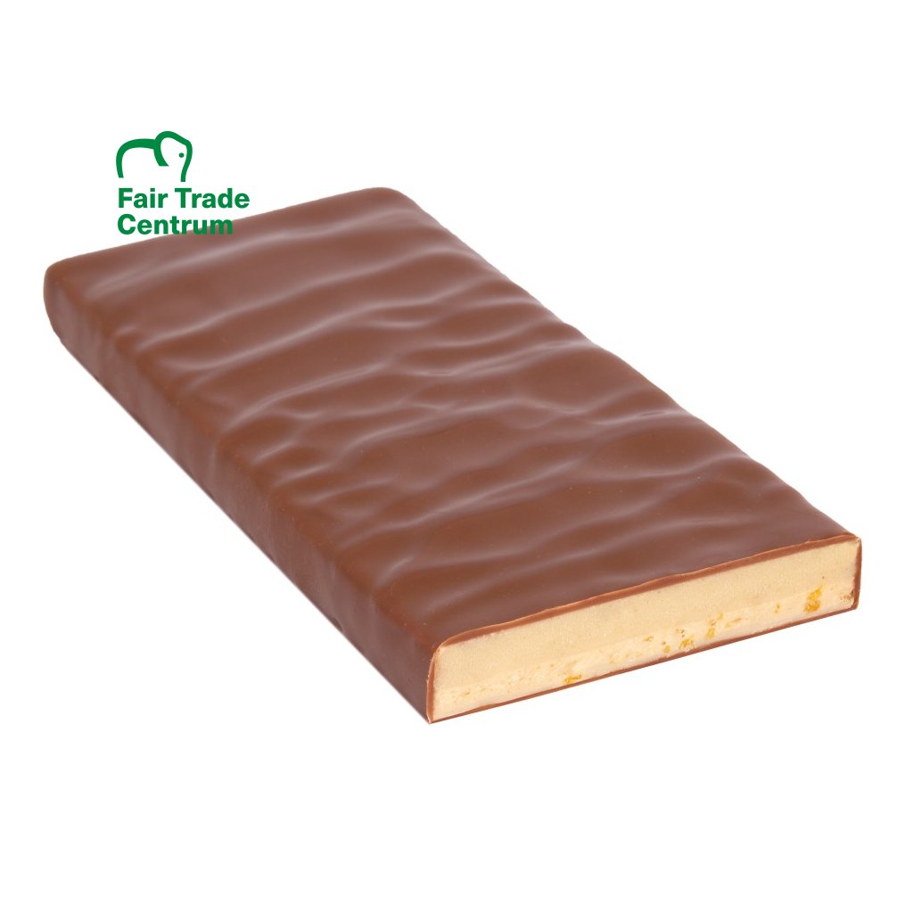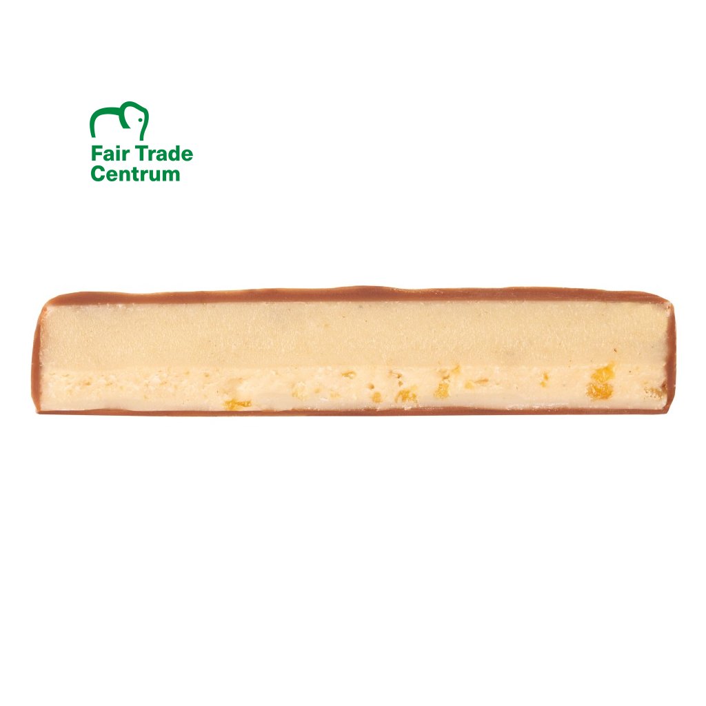 Magická fair trade bio mléčná čokoláda ručně plněnou skvělou bohatě vanilkovou vrstvou (40 %) stvořenou z pravé bourbonské vanilky, bílé čokolády, šlehačky a horského mléka z tyrolských Alp. Pod ní ještě vánoční čokoládový kouzelník vykouzlil jako obláček nugátovou mandlovou vrstvu (20 %) s křupajícími kousky mandliček (2 %).