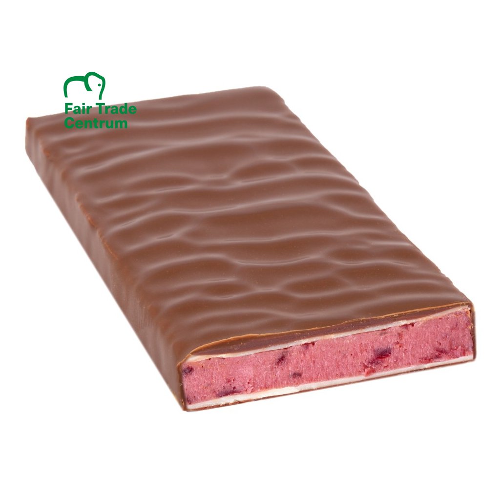 Skvěle vyvážená fair trade bio mléčná čokoláda s 50 % kvalitního kakaa a horským mlékem z Tyrolských Alp. Ručně naplněná ovocnou třešňovou náplní s malými kousky višní Amarena (60 %), kterou připravili přímo v čokoládovně bez použití jakýchkoli umělých barviv či aromat. Její krásně růžová barva vychází přirozeně jen z použitých višní. Třešňovou polevu obohacuje trocha marcipánu a pravá vanilka z Madagaskaru. Nakonec je z obou stran zalita tenkou vrstvou bílé čokolády a až následně obalena mléčnou čokoládou.