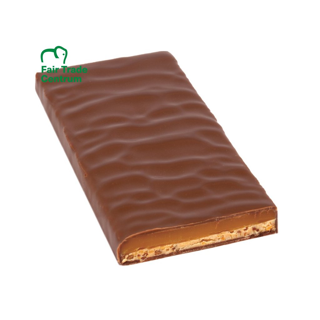 Výborná fair trade bio mléčná čokoláda s 50 % kvalitního kakaa a horským mlékem z Tyrolských Alp. V ní se ukrývá vynikající náplň z poctivého tuhého karamelu smíchaného s máslem (34 %), který už sám o sobě chutná pohádkově. Kdyby byl tekutý jako jiné máslové karamely, nedokázali by jím lidé v čokoládovně Zotter čokoládu ručně naplnit. Toto sladké pokušení je však doplněno ještě vrstvou mandlového nugátu (22 %), ve kterém najdete také sladce křupavé karamelové křupinky (6 %).