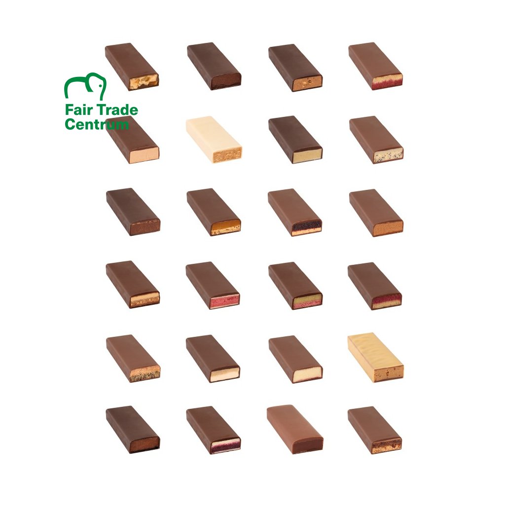 V tomto stylovém a skutečně velkoformátovém adventním kalendáři najdete na 24 různých ručně plněných mini čokolád. Každá z nich váží 20 g, celkem si tak zpříjemníte advent 480 g fantastických plněných čokolád. Představu o šíři příchutí si můžete udělat v naší nabídce. Celý tento úžasný čokoládový sortiment je v bio kvalitě, obchodový dle pravidel fair trade a doplněný skvělým designem od Andrease H. Gratze. Slavnostní čekání na narození Krista tak bude ještě radostnější a sladší. Některé z čokolád obsahují i více než 2 % alkoholu.