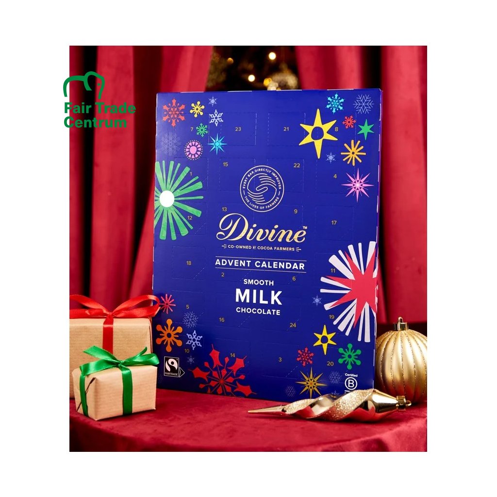 Mléčná čokoláda v tomto kalendáři se zřekla všech náhražek a cizích tuků, ale stále využívá slunečnicový lecitin pro lepší konzistenci čokolády. V naší široké nabídce fairtradových adventních kalendářů je Divine také jedinou značkou, která stále používá hliníkovou fólii uvnitř kalendáře. Certifikace Fairtrade v omezené verzi tzv. hmotnostního poměru mimo jiné zakazuje dětskou práci a nabízí pěstitelům důstojnou mzdu za jejich produkci. Pěstitelé kakaa v této čokoládě nejsou pyšní jen na své kakao, ale také na samotnou čokoládovnu Divine ve Velké Británii, kterou z malé části spoluvlastní a částečně mohou ovlivňovat její chod. Letos slaví 24 let výroby Fairtrade čokolády.