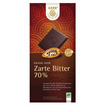 Bio hořká čokoláda se 70 % kakaa. Poškozený obal z přepravy a polámaná čokoláda.